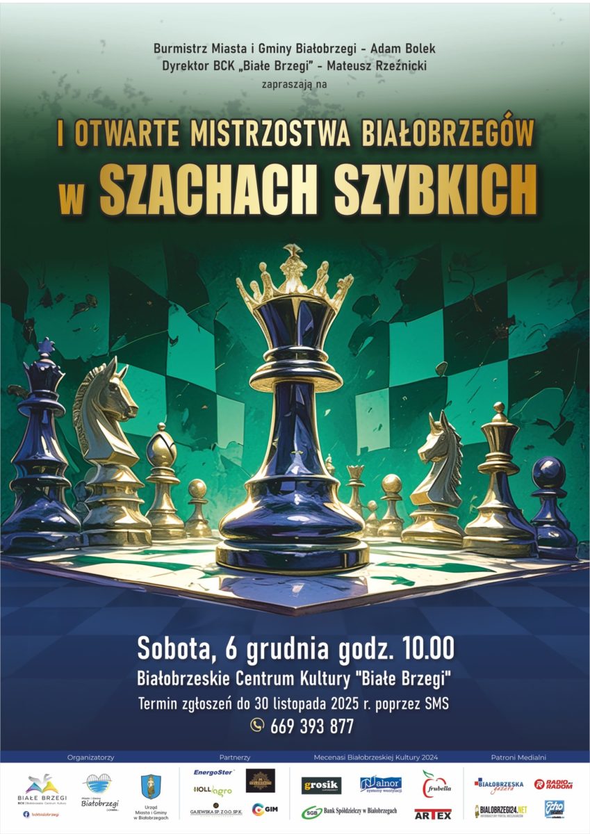 9 stycznia, 2026Serdecznie zapraszamy wszystkich miłośników królewskiej gry do udziału w „I Otwartych Mistrzostwach Białobrzegów w Szachach Szybkich”, które odbędą się 6 grudnia 2025 r. o godzinie 10.00 w Białobrzeskim Centrum Kultury „Białe Brzegi”.